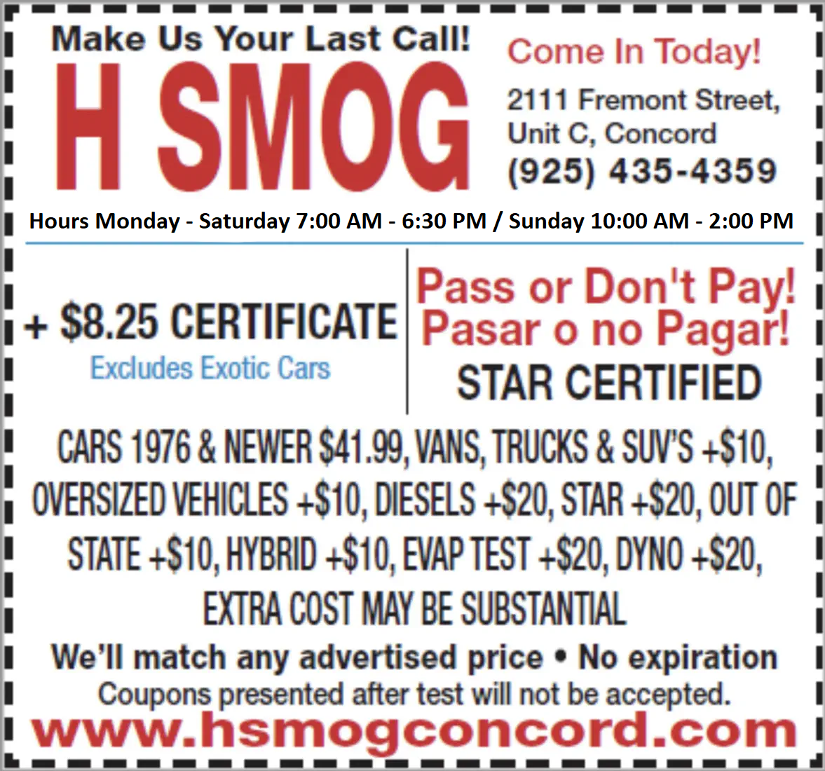 - Smog Check: $41.99* (Monday-Saturday) with coupon only